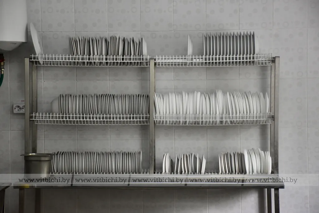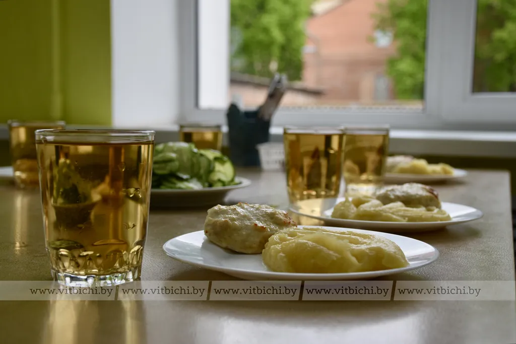 Команда пищеблока небольшая – всего шесть человек, двое из которых повара. Тем не менее, успевают накормить за день более тысячи человек. Плюс готовят и для участников различных конкурсов, соревнований и олимпиад, часто проходящих на базе гимназии. Столовая рассчитана на 150 посадочных мест. Заведующий производством ОАО «Витмил» Наталья Ревкович рассказала, что система питания организована в две смены. Питаются гимназисты поточно, по классам, начиная с 8.45 и до 16.45. К сервировке столов привлекают и самих учащихся. Дежурные помогают расставлять тарелки с едой, раскладывают хлеб, салфетки и столовые приборы.
