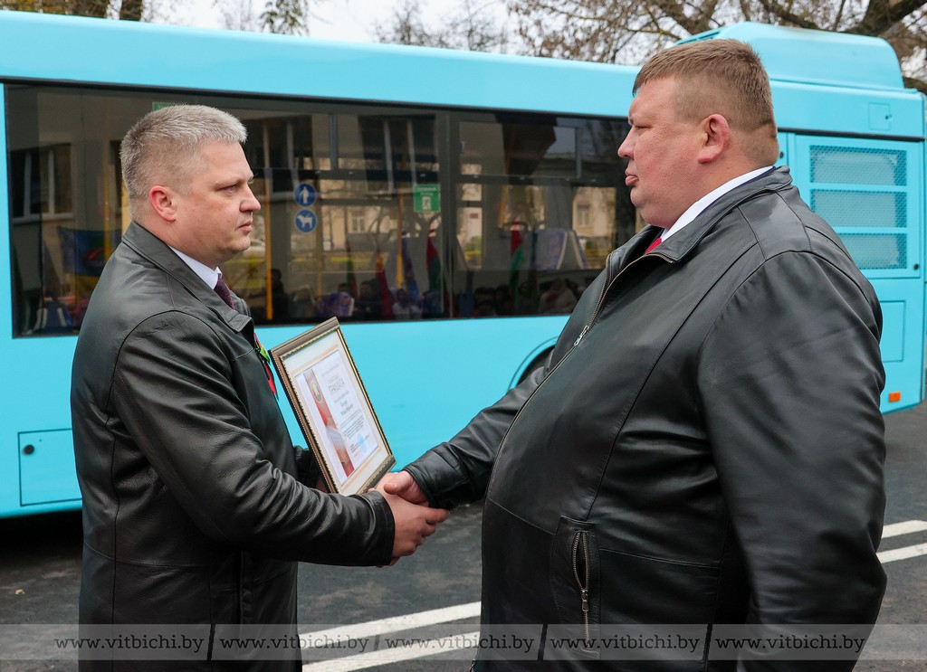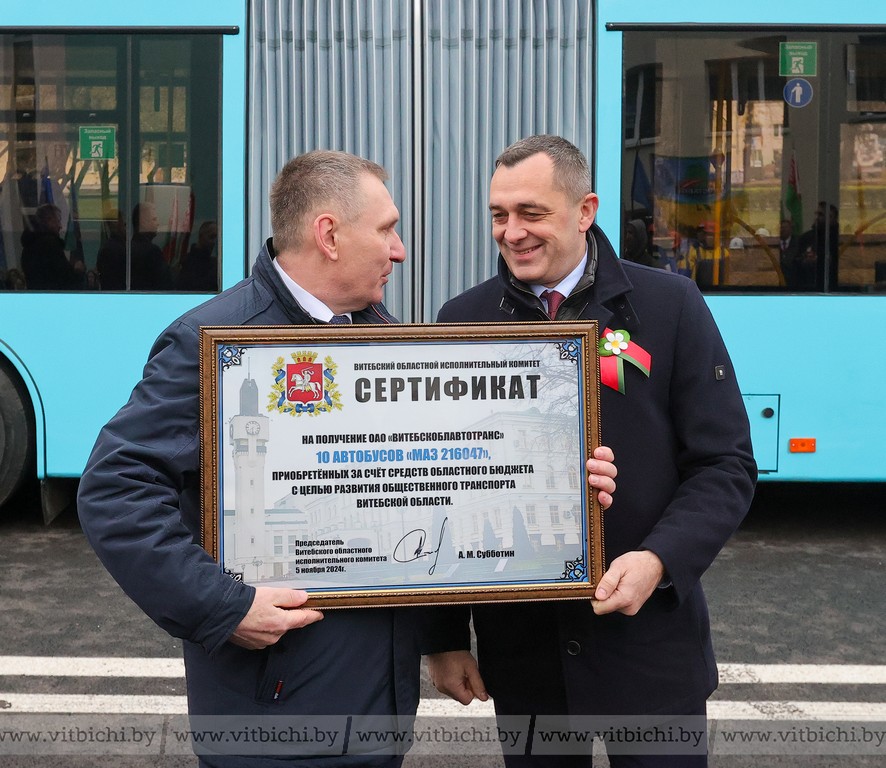 В торжественной обстановке Александр Субботин вручил сертификат на 10 новых автобусов «МАЗ 216047», приобретенных за счет областного бюджета, генеральному директору ОАО «Витебскоблавтотранс» Александру Федуковичу.