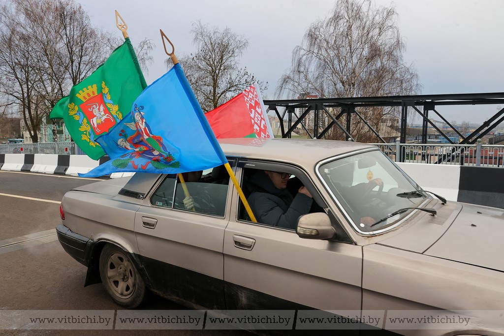 Руководители области, города и мостостроительного управления № 5 перерезали красную ленточку, и новые автобусы, а затем и участники автопробега общественного объединения «Патриоты Беларуси» открыли движение по обновленному путепроводу.