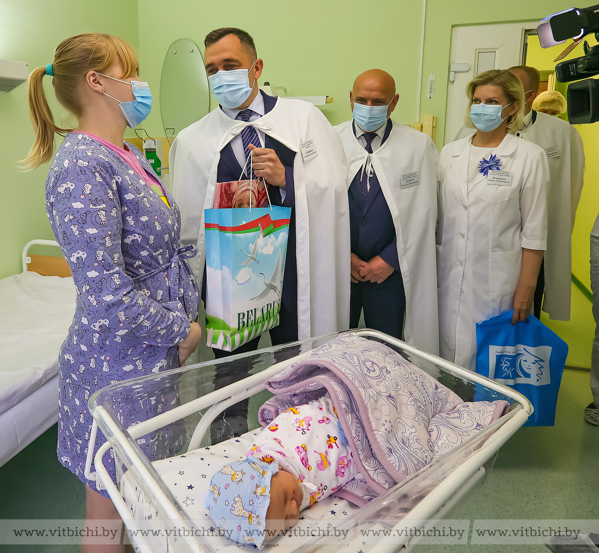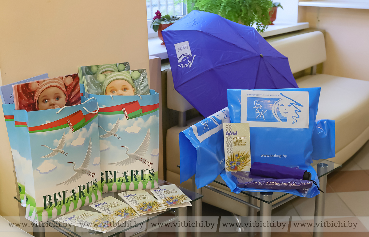 Глава области поздравил женщин с рождением сыновей вместе с председателем областной организации Белорусского союза женщин Мариной Новицкой. Они вручили памятные подарки роженицам: зонтики и фартуки с логотипом БСЖ – от представительниц этой организации и наборы гигиенических принадлежностей для малышей, альбомы «Я счастливый малыш», в которых родители смогут записывать истории своих деток, – от губернатора.
