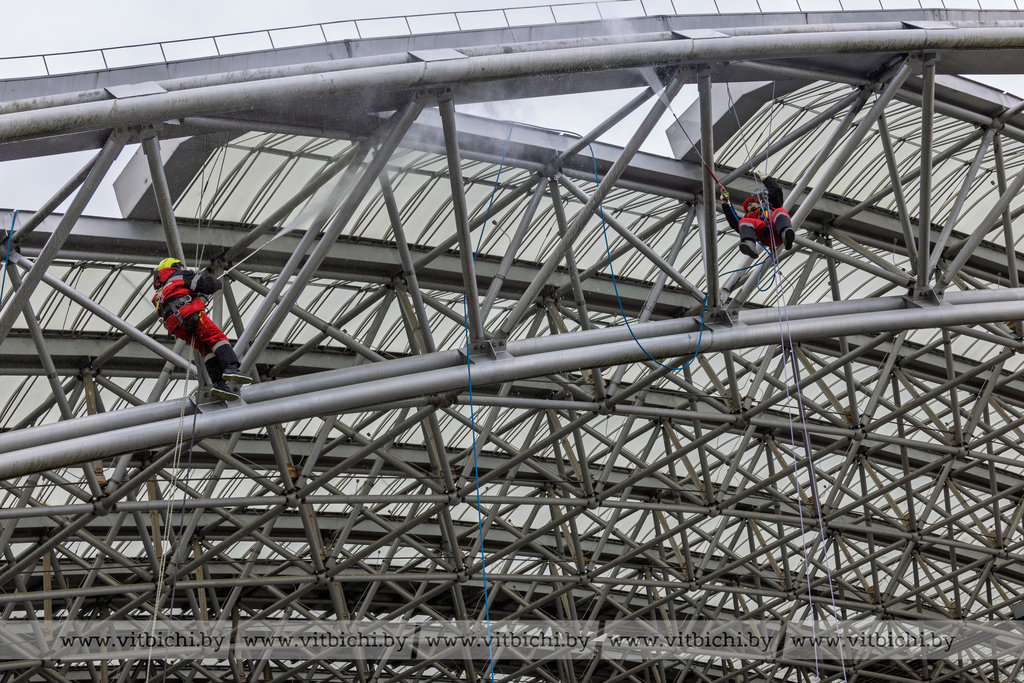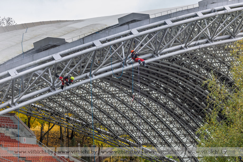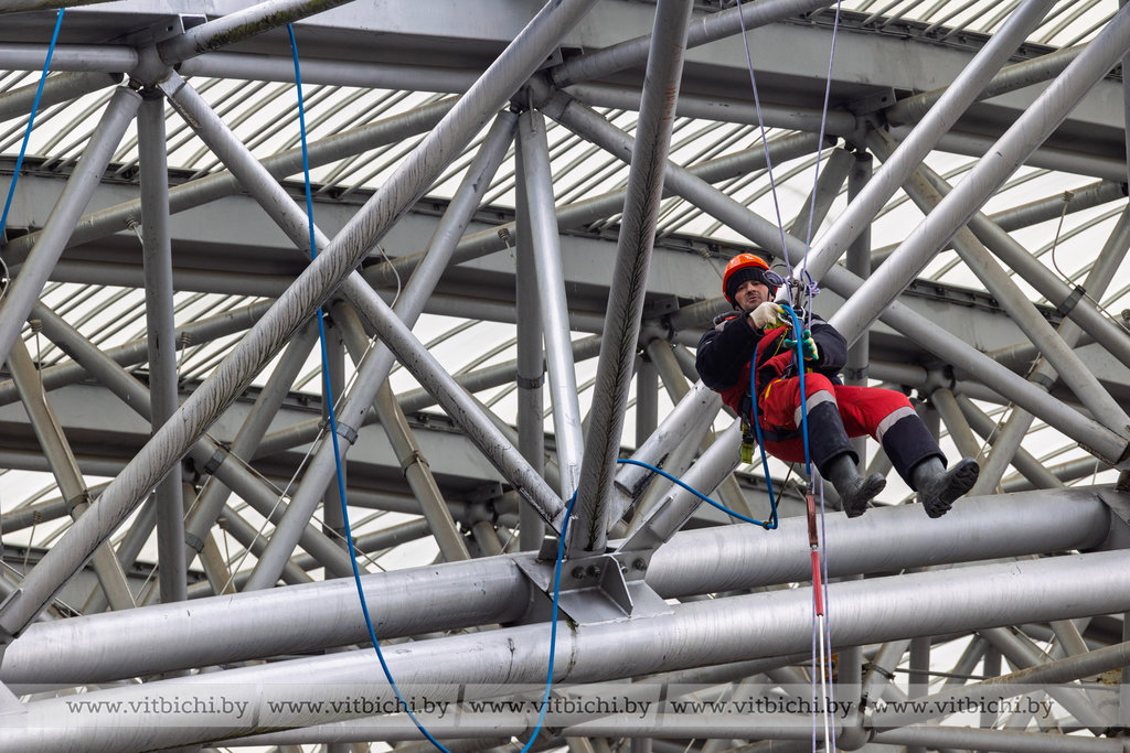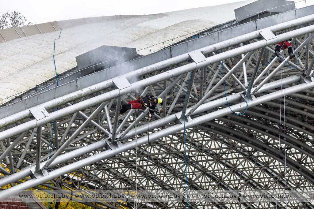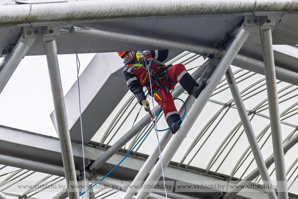 – Мы много лет занимаемся работами на высотных зданиях, крышах хранилищ, трубах заводов и фабрик, но нынешний объект для нас серьезный вызов. Прекрасно понимаем, что амфитеатр не только лицо Витебска, но и всей страны. Для работы сюда мы привлекаем только самых опытных и высококлассных специалистов, которых между собой называем «золотая четверка», – рассказала директор ЧТУП «АНАКОНДА ПРОФИ» Дарья Черноус.