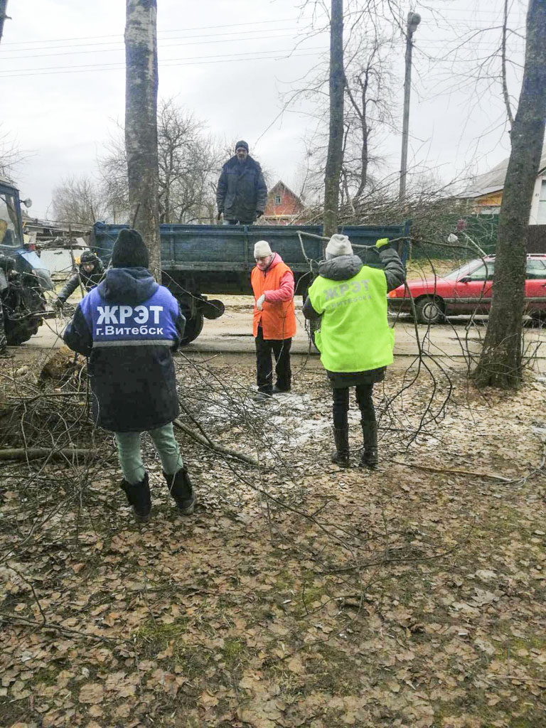 Больше 200 работников ЖРЭТа города Витебска и 10 единиц техники были задействованы на уборке мусора на улицах Комсомольской, Жесткова, Доватора, Гагарина, Зеньковой, Димитрова, проспектах Людникова, Фрунзе. Свыше 140 кубических метров спиленных веток вывезли с дворовых территорий.