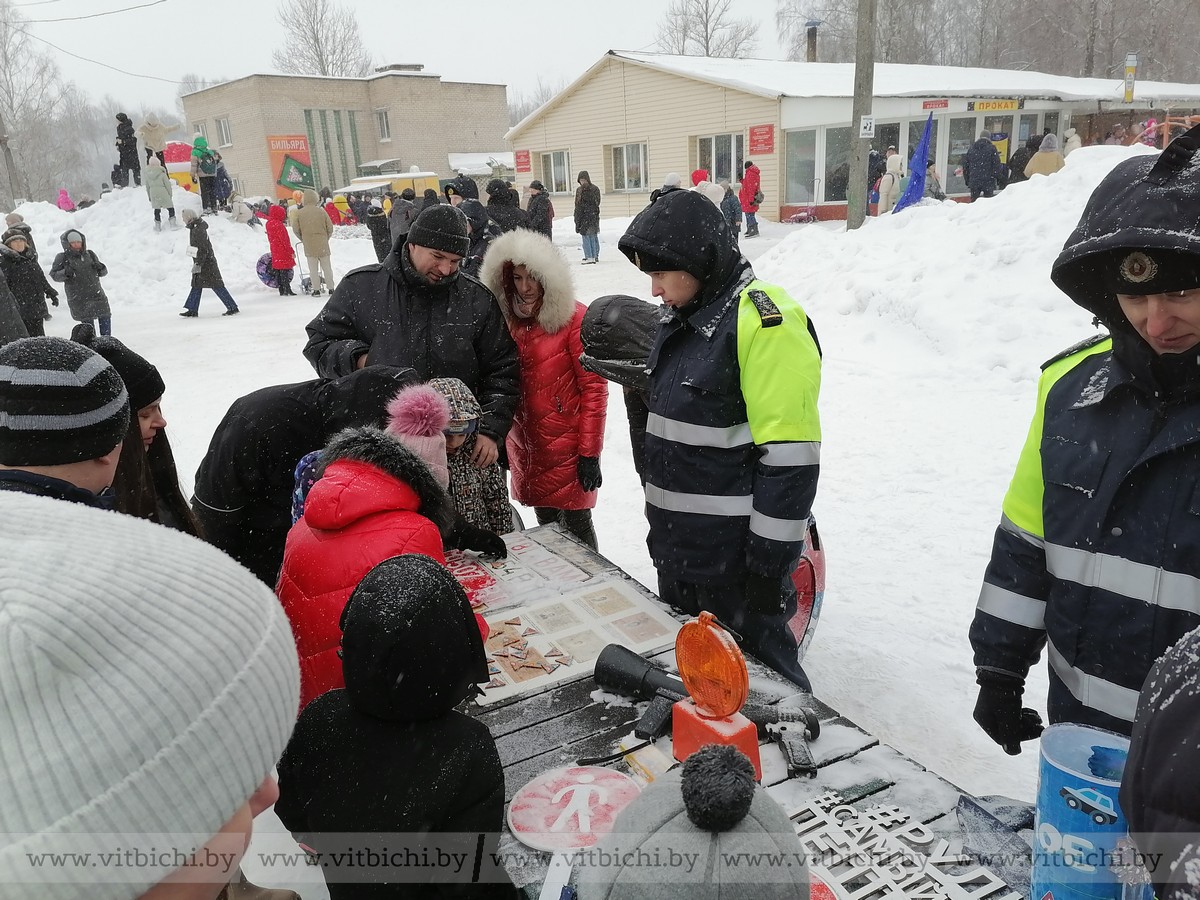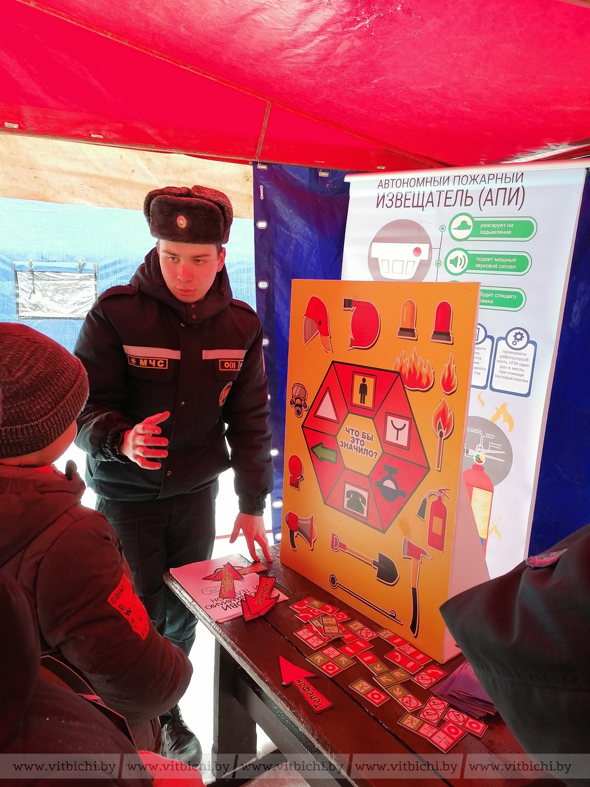 На мероприятии также работали интерактивные площадки МЧС и ГАИ, где дети и взрослые могли узнать, как действовать при пожаре, вспомнить правила дорожного движения и сфотографироваться в форме и с атрибутами инспекции, а за участие получить небольшие, но все равно приятные сувениры. Еще можно было зайти в специальной маске с оборудованием и тяжелым баллоном на спине, будто в скафандре, в пункт обогрева Витебского УМЧС – палатку наполненную горячим воздухом, куда желающих сопровождали сотрудники таинственно застегивая за собой замок.