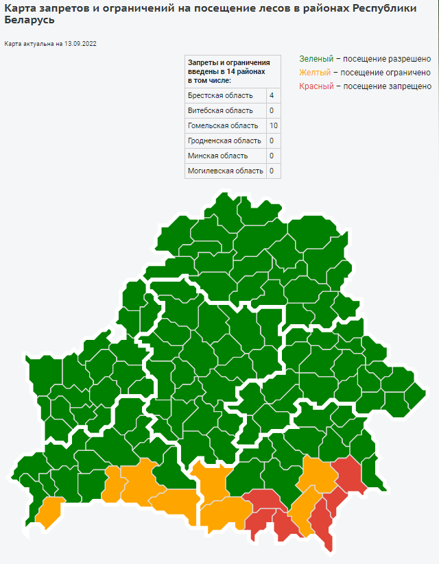 Запрет на посещение лесов снят уже во всех районах Витебской области - на интерактивной карте запретов и ограничений на посещение лесов все районы находятся в "зеленой" зоне. Это связано с погодными изменениями – прошли дожди, что снизило вероятность возникновения пожаров.
