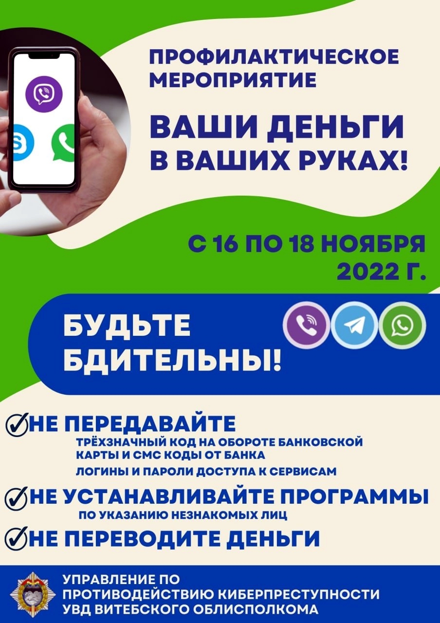 С 16 по 18 ноября 2022 года проводится комплексное профилактическое мероприятие «Ваши деньги в ваших руках». Как рассказали в группе противодействия киберпреступлениям КМ ОВД администрации Первомайского района Витебска с начала года на территории Первомайского района областного центра зарегистрировано более 250 киберпреступлений. Свыше 200 — это хищения имущества путём модификации компьютерной информации.