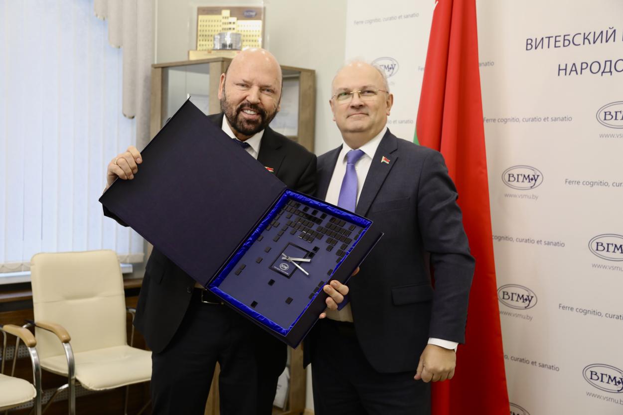 Гостя приветствовали заместитель председателя Витебского облисполкома Вячеслав Дурнов, начальник главного управления по здравоохранению Витебского облисполкома Михаил Вишневецкий, ректор ВГМУ Алексей Чуканов, проректор по международным связям и организационно-правовой работе Денис Лиц, руководители международных подразделений вуза: начальник управления международных и межрегиональных связей Елена Шарыхина и начальник отдела международных связей Анна Пчелинцева.