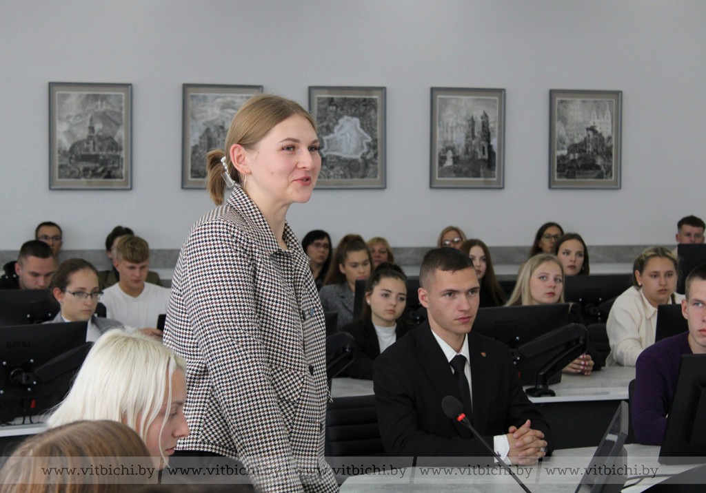 В рамках серии встреч «Твое время – твои возможности» Виктор Николайкин рассказал парням и девушкам о своих студенческих годах, а также депутатской деятельности, касающейся работы над различными законопроектами, имеющими прямое отношение к сфере образования. Студенческая пора, по мнению депутата, самая лучшая и интересная в жизни каждого человека. Ее нужно использовать максимально эффективно, быть активным и прилежным не только в учебе, но и в общественной деятельности. В последующем это даст бесценный опыт и обязательно поспособствует в дальнейшем профессиональному росту и продвижению по карьерной лестнице. Отличной стартовой площадкой в успешное будущее для студентов может стать самый большой район нашего города – Первомайский, на территории которого и находится вуз. Сегодня здесь проживает 194 тысячи человек, из них 37 тысяч – молодежь, функционирует свыше 30 промышленных и строительных предприятий и организаций. Как подчеркнул глава администрации района Евгений Семёнычев, с каждым годом Первомайский становится более комфортным для его жителей, в том числе и молодежи. Так, этим летом отличным подарком для всех стал открытый парк Тысячелетия Витебска, а уже к следующему дню рождения города здесь появится современный просторный скейтпарк. Сейчас идет его проектирование. Призвала активно предлагать свои идеи и проекты по благоустройству и организации досуга в районе заместитель главы администрации по социальным вопросам Татьяна Лазуркина. Двери ее кабинета всегда открыты для самых смелых, творческих и неравнодушных.