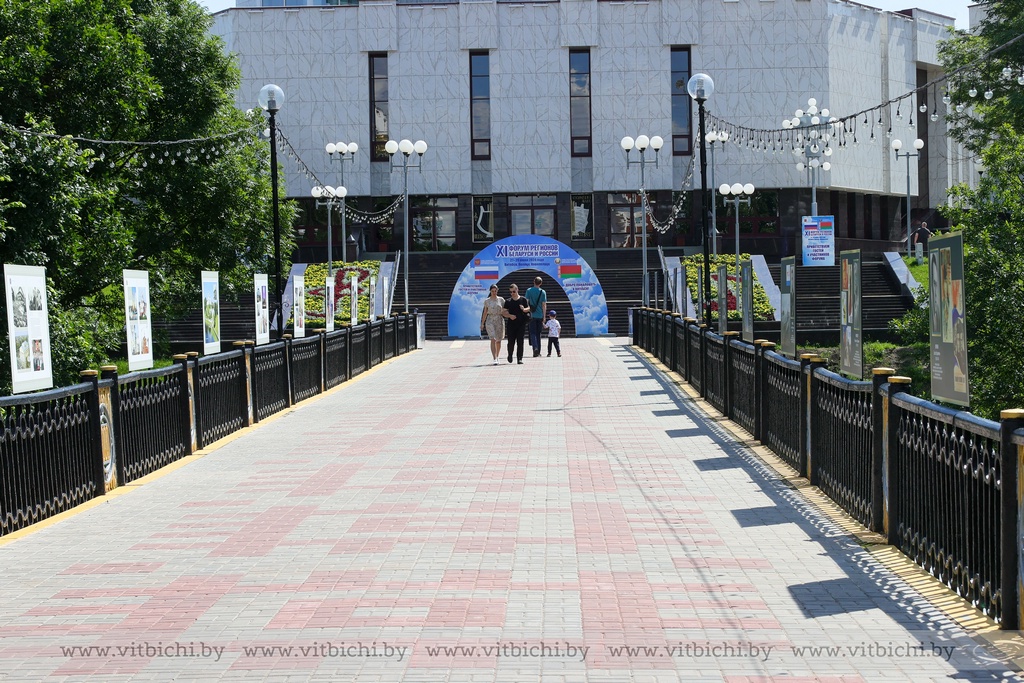 Одной из центральных площадок форума является обновленный концертный зал «Витебск». Возможно, не только гостям города, но и его жителям будет интересно ознакомиться с выставкой «Витебск исторический». Экспозиция разместилась на подходе к КЗ — на специальных конструкциях, размещенных на мосту 1000-летия Витебска.