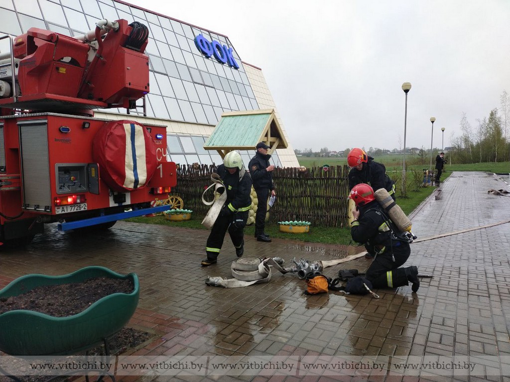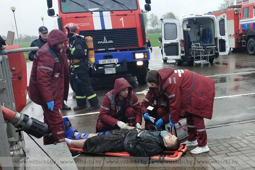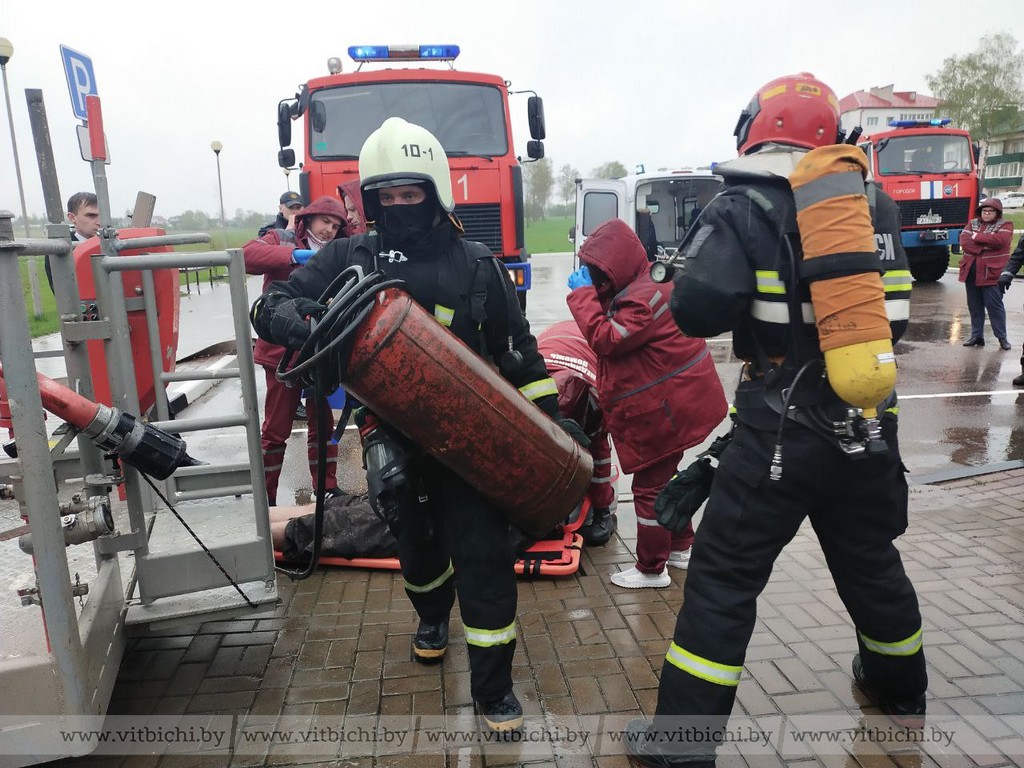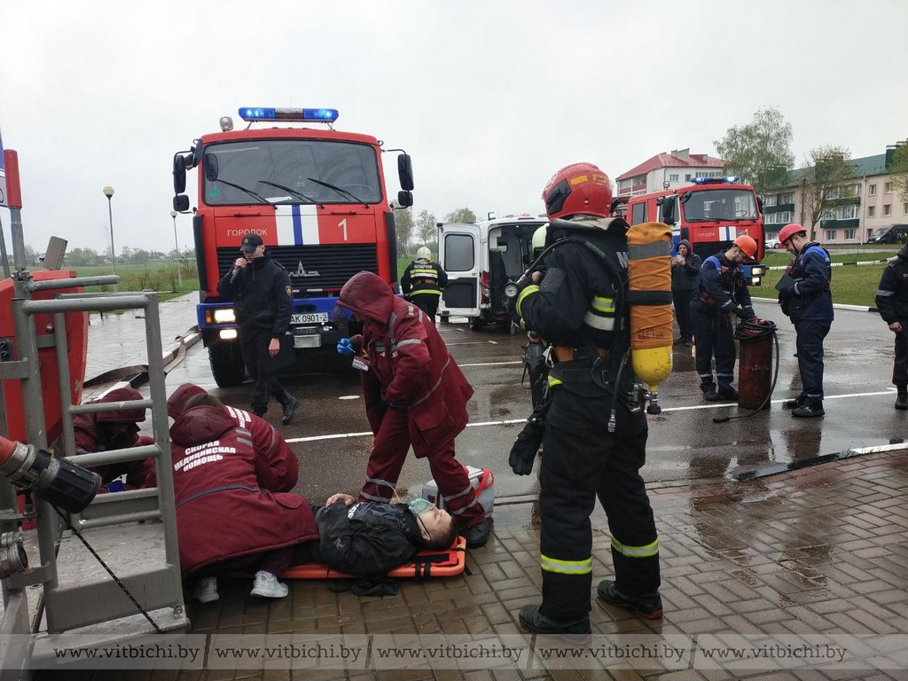 Семинар продолжился практическими занятиями -- отработкой ликвидации последствий условной аварии на кровле физкультурно-оздоровительного комплекса и спасения "пострадавших". Был смоделирован несчастный случай в результате нарушения правил по охране труда при выполнении строительных работ на высоте и взрыва газового баллона. В отработке участвовали сотрудники Городокского РОЧС, РОВД, Городокского района газоснабжения, Центральной районной больницы. Успешное выполнение задачи обеспечила слаженность совместных действий. Спасатели на коленчатом подъемнике сняли с крыши условно пострадавшего и передали медицинским работникам. Милиция оцепила здание, представители газовой службы провели необходимые аварийные работы.