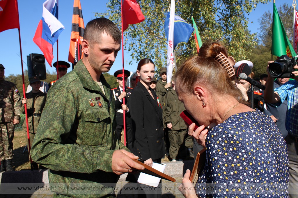 Председатель Витебского районного Совета депутатов Виктор Дорожкин вручил благодарственные письма за сотрудничество в увековечивании памяти защитников Отечества, погибших в годы войны, коллективу Витебского кадетского училища, кадетам и юнармейцам школы № 1374 города Москвы и командиру 52-го отдельного специализированного батальона подполковнику Андрею Рубину.