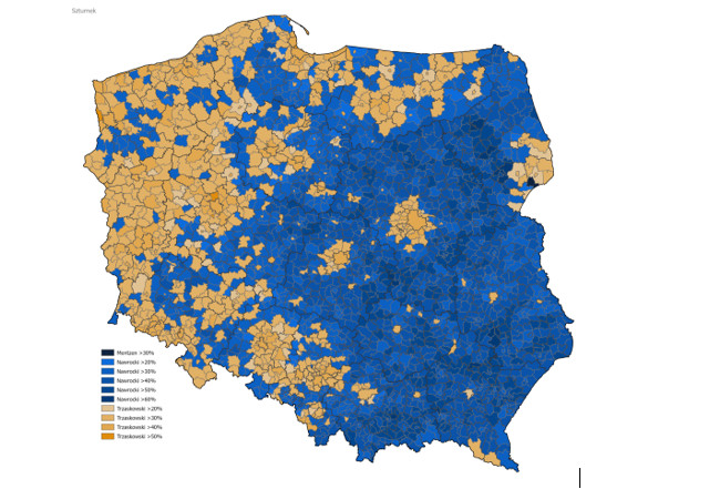 Польша подошла к выборам 2025 года глубоко расколотой на два враждующих племени – условно «либерально-городское» и «консервативно-провинциальное». География голосования вновь расписала страну в цвета этого раскола. Западные и северные воеводства дружно позолотели за Тшасковского, тогда как восток и юг посинели голосами за Навроцкого – почти зеркальное повторение известного разделения на «Поланд А» и «Поланд Б».