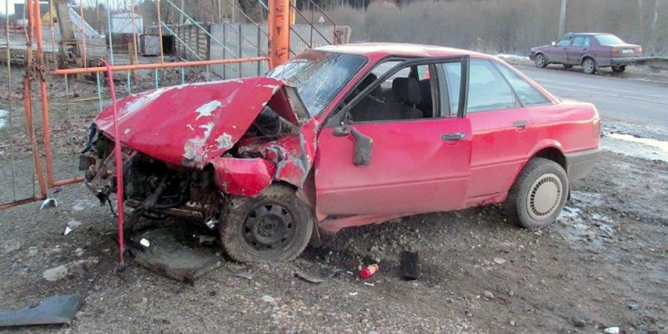 После этого Audi совершил столкновение с фурой, которая была припаркована на противоположной стороне дороги, а затем с бетонной стеной.