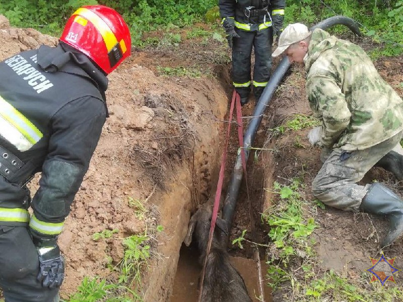 Утром 1 июня спасателям поступило сообщение, что лось провалился в яму для прокладки коммуникаций вблизи д. Конюхово Россонского района.