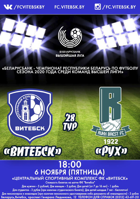 В 28-м туре чемпионата Беларуси по футболу, 6 ноября, ФК «Витебск» на своем поле примет брестский «Рух». Начало матча в 18.00.
