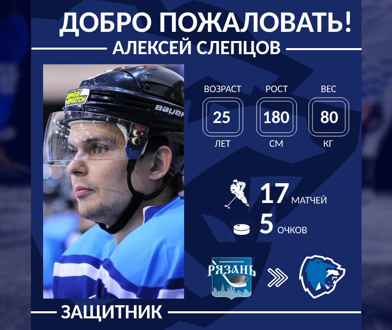ХК «Витебск» подписал контракт с Алексеем Слепцовым. Текущий сезон 25-летний защитник начинал в ХК «Рязань» (ВХЛ), где провел 17 матчей и набрал 5 (3+2) очков.