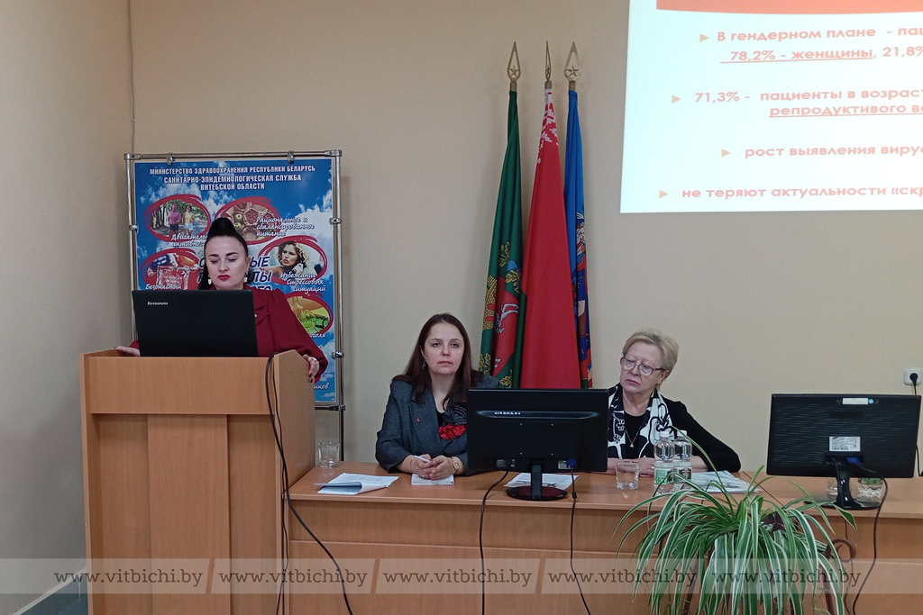 Врач-инфекционист областной клинической инфекционной больницы Анжелика Герасимёнок остановилась на современных подходах к антиретровирусной терапии и факторах, влияющих на приверженность к лечению ВИЧ-инфекции. Врач психиатр-нарколог областного клинического центра психиатрии и наркологии Ирина Щелкунова, проанализировав ситуацию с заболеваемостью, рассказала о работе по профилактике ВИЧ среди уязвимых групп населения. О деятельности негосударственных организаций в этом направлении в рамках реализации государственного социального заказа в Витебской области проинформировала главная медсестра областной организации Красного Креста Анна Семенидо. Старший оперуполномоченный по особо важным делам управления по наркоконтролю и противодействию торговле людьми криминальной милиции УВД облисполкома Сергей Альхименко рассказал о служебной деятельности в рамках реализации Государственной программы «Здоровье народа и демографическая безопасность» на 2021–2025 годы.