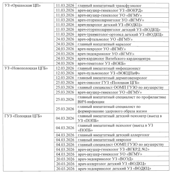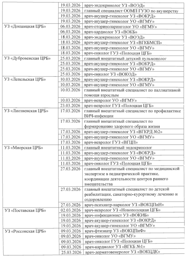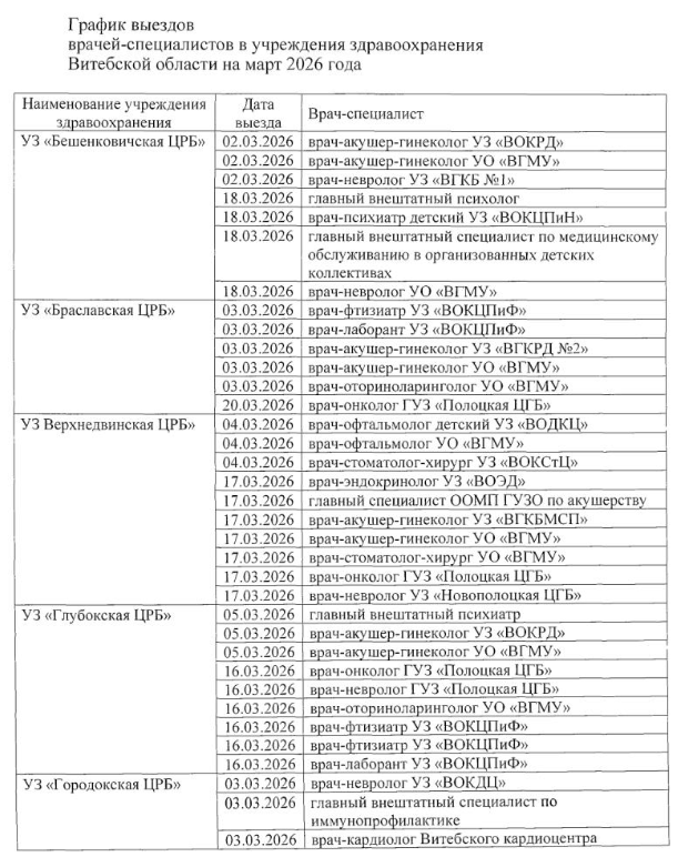В марте 2026 года жители районов Витебской области смогут получить консультации ведущих врачей-специалистов без поездки в областной центр. Главное управление по здравоохранению Витебского облисполкома утвердило сводный график выездов врачей в учреждения здравоохранения региона для оказания лечебно-консультативной помощи населению.